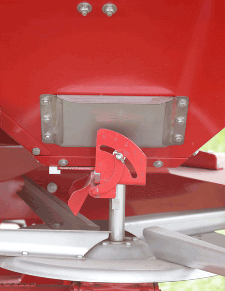 Boquillas de dosificación con regulación de entrega de material sobre las paletas esparcidoras.